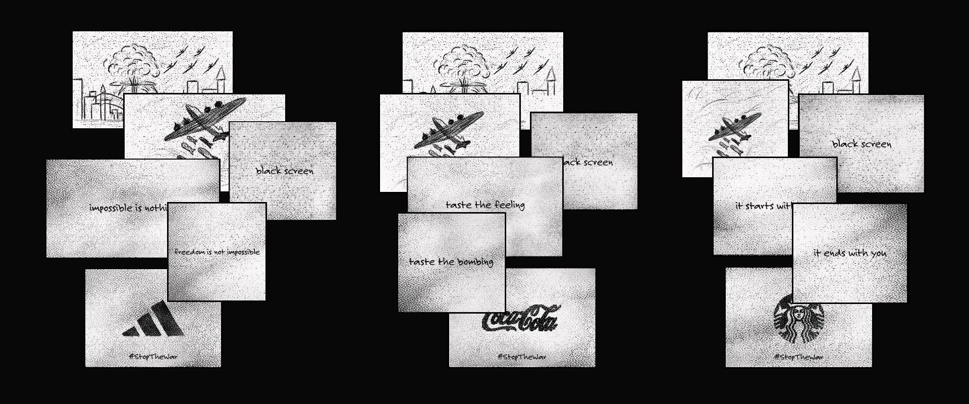 In the last year of our university education, as a final project in the “Advertising Knowledge” course, we were asked to make a remarkable commercial with a creative idea. We looked at big brands that support war or choose not to prevent innocent people from suffering.